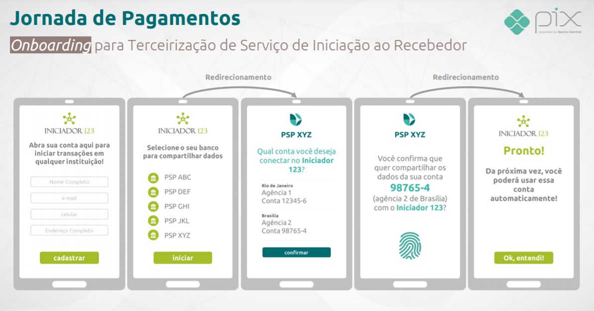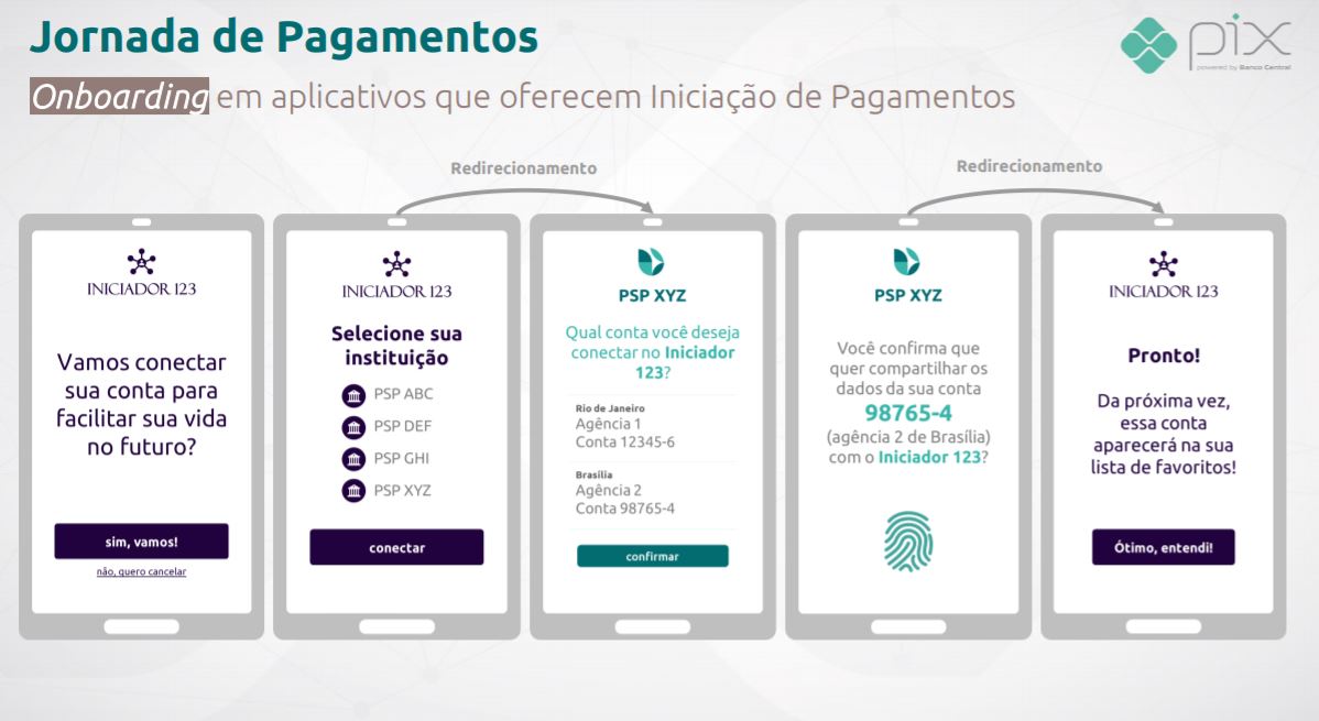 Assim, em ambos os casos a jornada seria um pouco diferente, segundo o BC. Marina e João entram nos canais dos iniciadores, e dentro dos apps dão seus respectivos consentimentos para que os apps se conectem às contas de seus bancos (de onde o dinheiro sai).