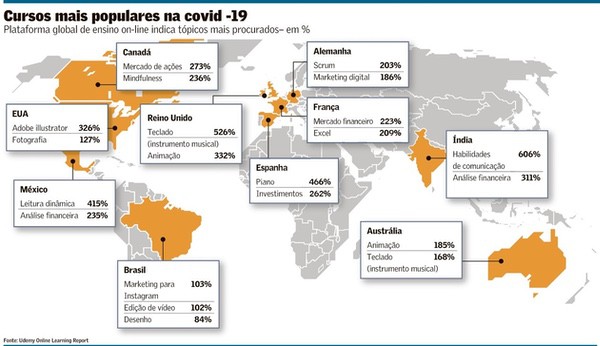 Nos últimos dois meses, o confinamento fez disparar a procura por cursos on-line, dos mais variados temas. Das aulas de desenho à metodologia Scrum, a busca por conhecimento rápido virou febre na maior parte dos países. A Udemy, maior plataforma de cursos virtuais do mundo, gratuitos ou com preços bem acessíveis, registrou um aumento de 425% nas matrículas globais apensa nesse período. No Brasil, esse crescimento foi de 95%.